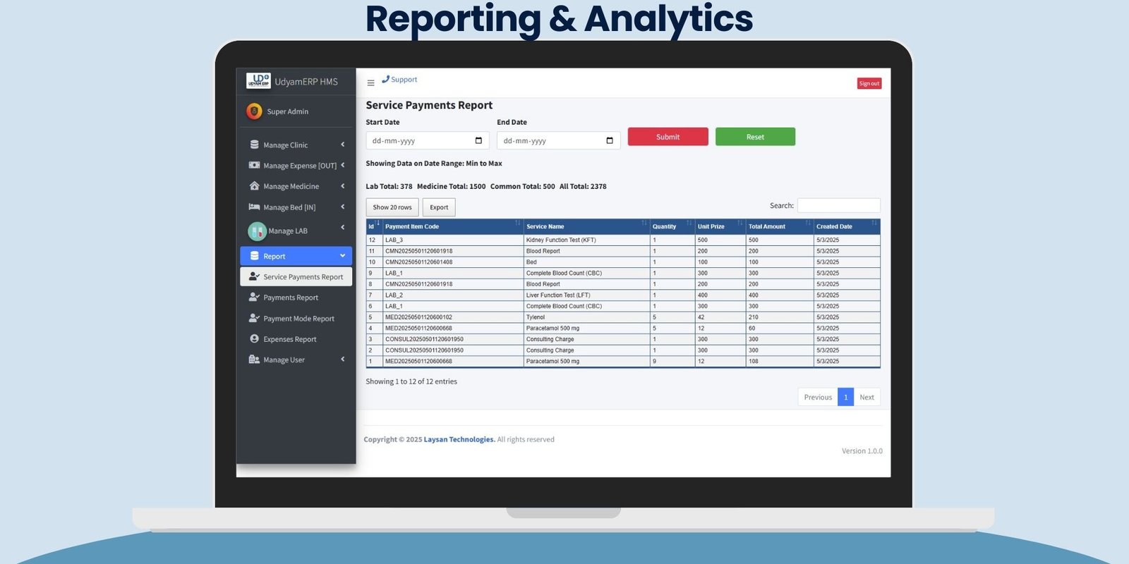 Track patient visits, lab tests, bed occupancy, revenue, and medicine sales.