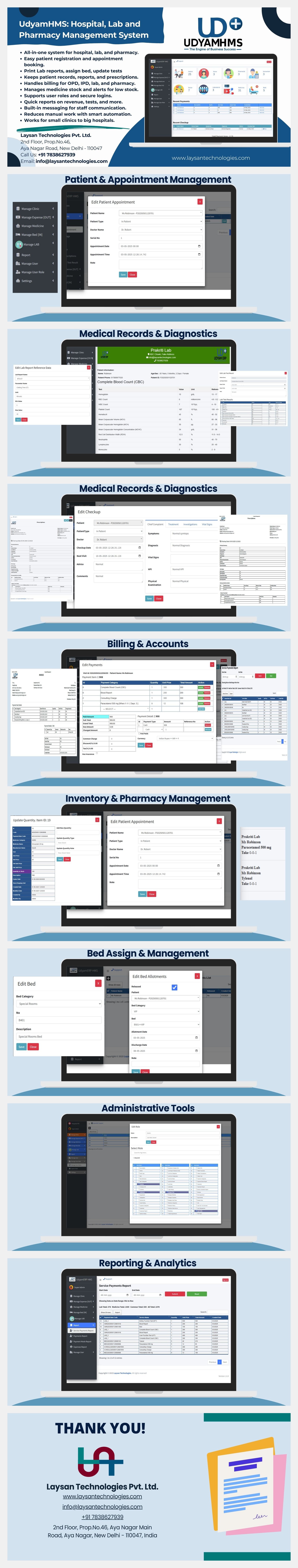 From patient registration and appointment scheduling to laboratory test reports, bed assignments, billing, and medicine inventory — UdyamHMS covers it all in one unified platform.