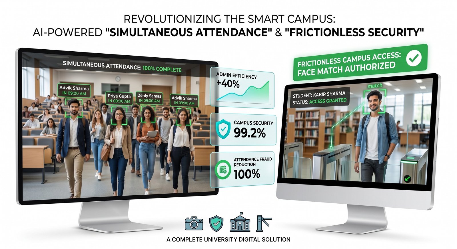 Traditional fingerprint and IRIS scanners are slow, unhygienic, and prone to "Proxy Attendance" (Buddy Punching). In a large college, roll calls waste up to 20% of teaching hours.
